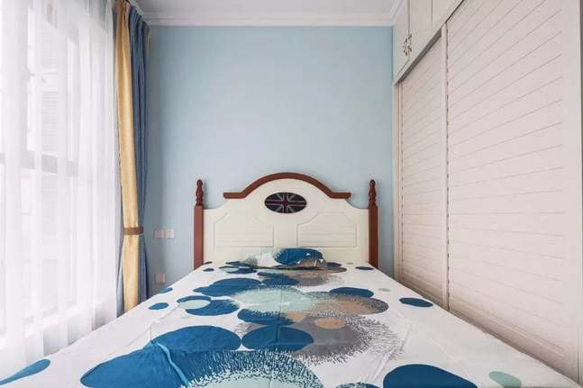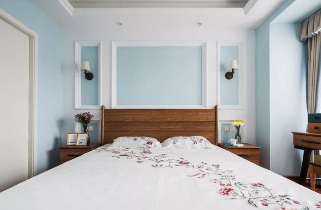 ▲臥室的床頭背景墻以邊框造型,造型內(nèi)部藍(lán)色+四周白色的藍(lán)白配,結(jié)合對稱的壁燈與床頭柜,整個(gè)空間都顯得格外的穩(wěn)重清新。床頭柜上布置著 精致的插花,一本書籍一個(gè)茶杯,整個(gè)空間都顯得情調(diào)而溫馨。