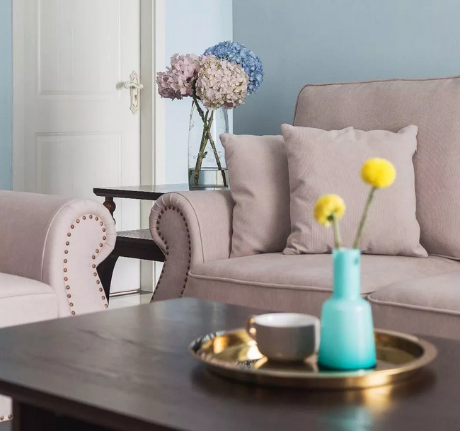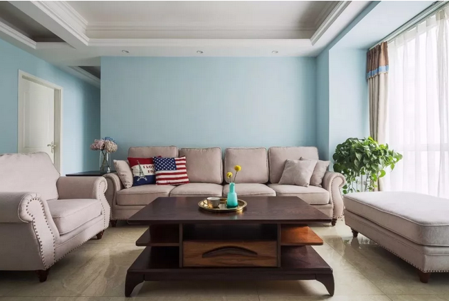 ▲整個(gè)開放區(qū)域的墻面都以淡藍(lán)色刷新,簡單卻又透著一股自然清新的氣息。一套舒適精致的現(xiàn)代美式布藝沙發(fā),布置在這個(gè)寬松的客廳里,顯得格外的舒適自然。