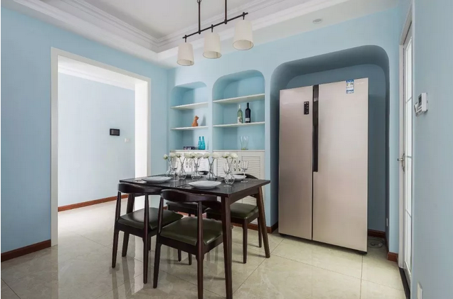 ▲餐廳擺著一套禪意極致的實(shí)木餐桌椅,同時(shí)餐邊柜是以壁龕入墻的方式安裝,并給冰箱留了一個(gè)壁洞,在圓滑的處理下,讓整個(gè)空間都顯得簡潔優(yōu)雅而又美觀。