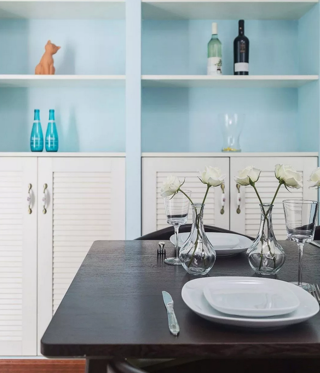 ▲餐邊柜上方的展示架上擺上精致的花瓶,結(jié)合餐桌上浪漫情調(diào)的插花,讓用餐的空間顯得溫馨感爆棚。