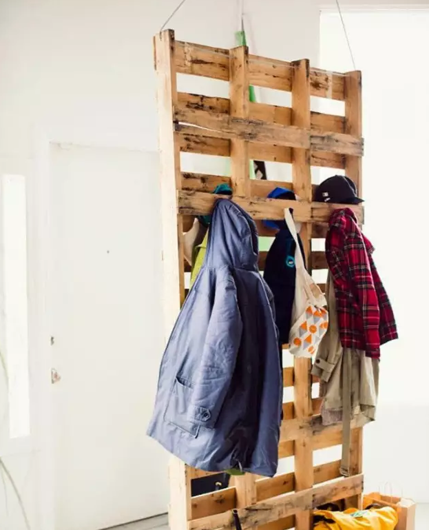廢物利用妙極了,粗獷的原木色,又有天然的掛桿,吊起來就是個(gè)完美的玄關(guān)隔斷。