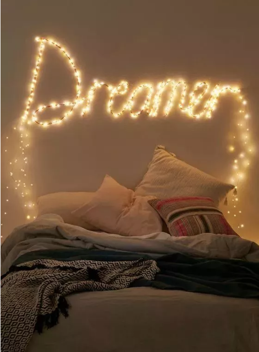 用串燈裝飾房間端端已經(jīng)介紹過(guò)很多次啦,用星星燈在床頭固定出一個(gè)具體的形狀來(lái)做裝飾,或者干脆做個(gè)照片墻效果也不錯(cuò)。