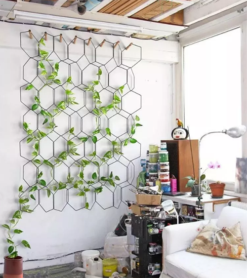 用金屬絲按規(guī)則或不規(guī)則的方式組合成一個(gè)整體,讓植物順著幾何架構(gòu)自然的延伸和生長(zhǎng),待它茂盛時(shí)你收獲的不僅是滿(mǎn)眼的綠色好風(fēng)景,更是清新怡人的好空氣。推薦植物:綠蘿。