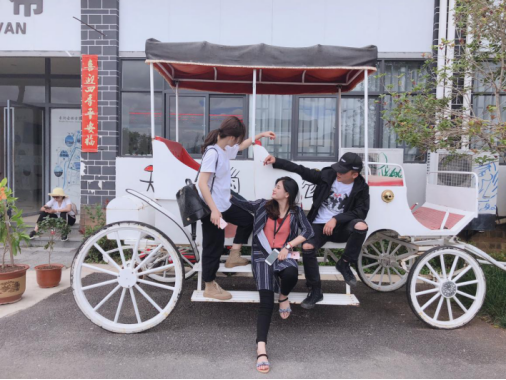 一家人坐在馬車(chē)上,享受著束河古鎮(zhèn)的寧?kù)o。