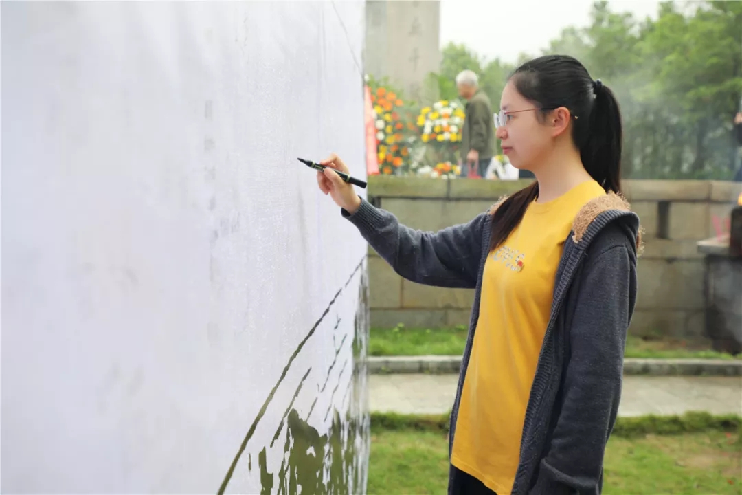 ▲黨支部代表李煥婷在烈士塔紀(jì)念墻簽字留念