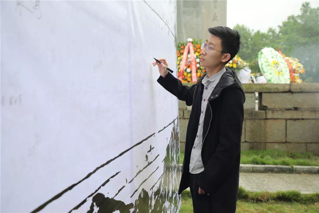 ▲黨支部代表陳夢(mèng)浩在烈士塔紀(jì)念墻簽字留念