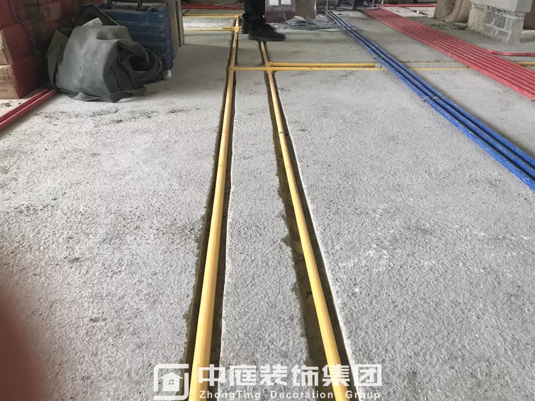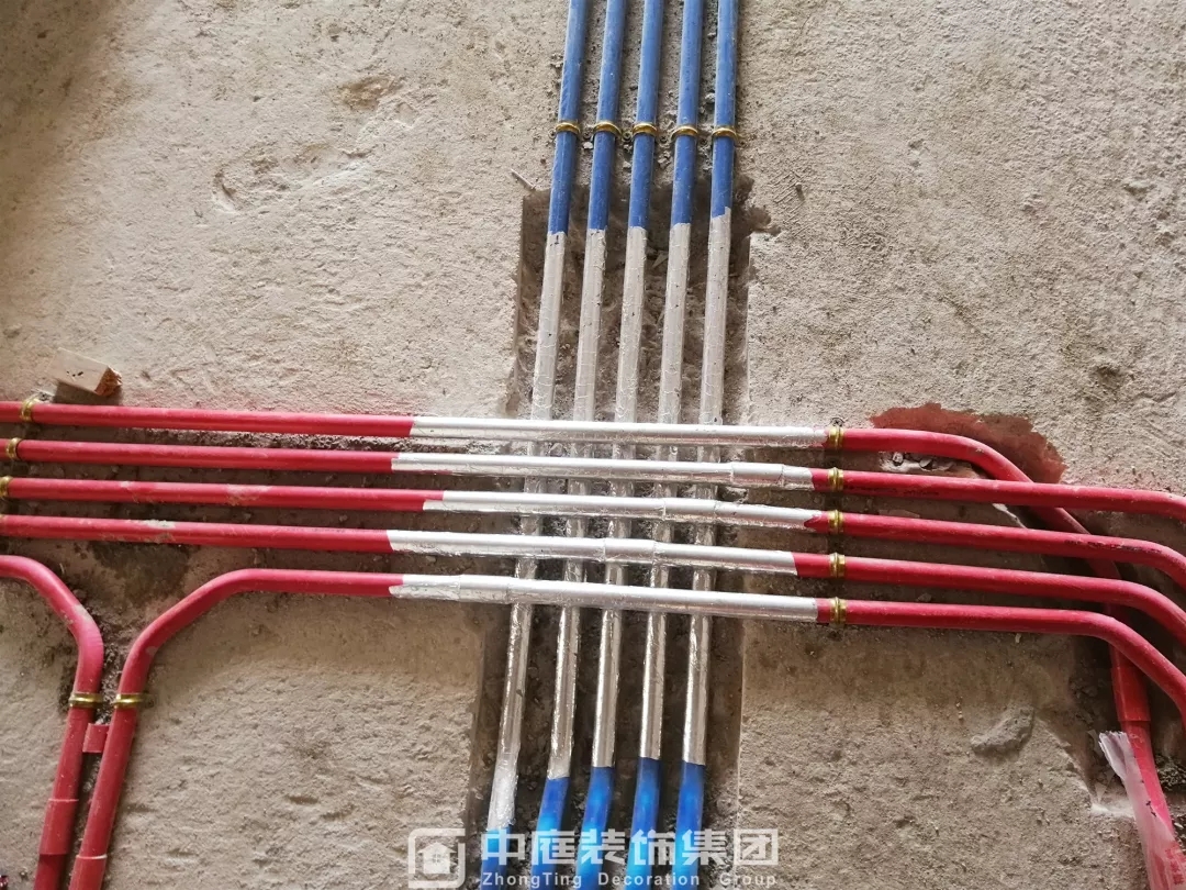 施工現(xiàn)場(chǎng)線管鋪設(shè)橫平豎直,按照集團(tuán)施工規(guī)定使用鐵皮卡扣固定,管和管之間留有足夠縫隙,以便鋪設(shè)地磚時(shí)水泥砂漿進(jìn)入管下,避免地磚后期出現(xiàn)空鼓;強(qiáng)弱電交匯處,用錫紙包裹保護(hù),可以有效防止對(duì)弱電產(chǎn)生信號(hào)干擾。