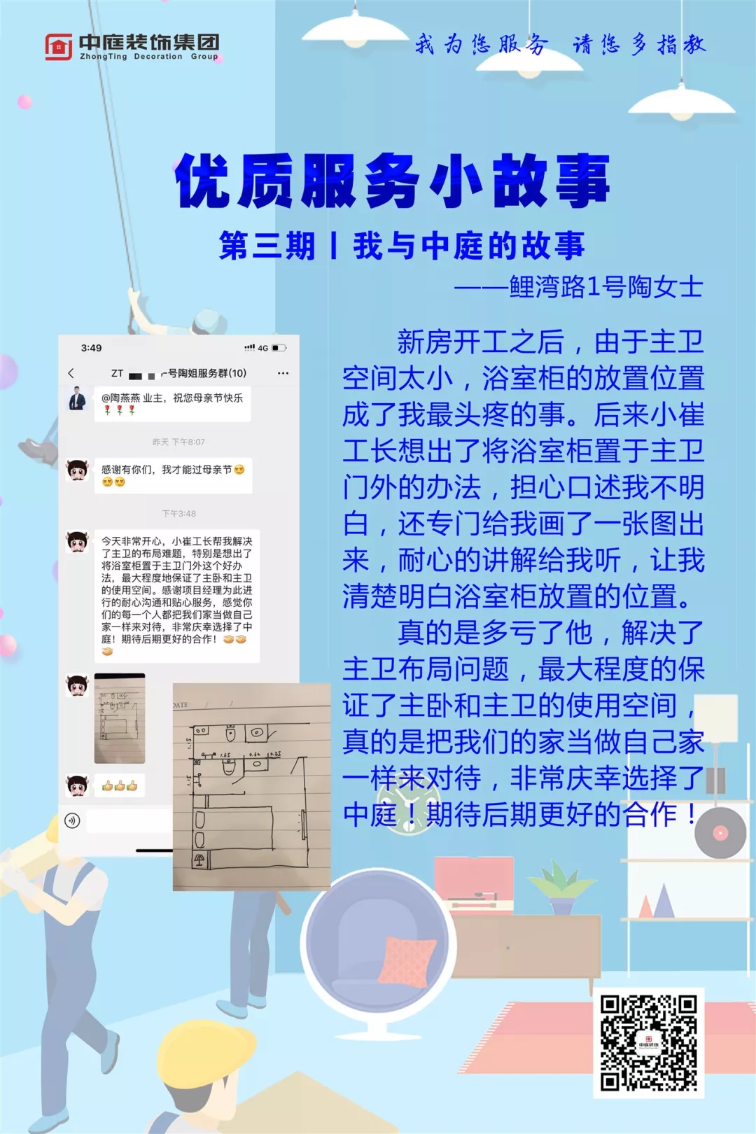 首席設計師廖吉柯服務客戶到凌晨,專業(yè)的服務讓客戶選擇了中庭,與中庭攜手共筑愛家。