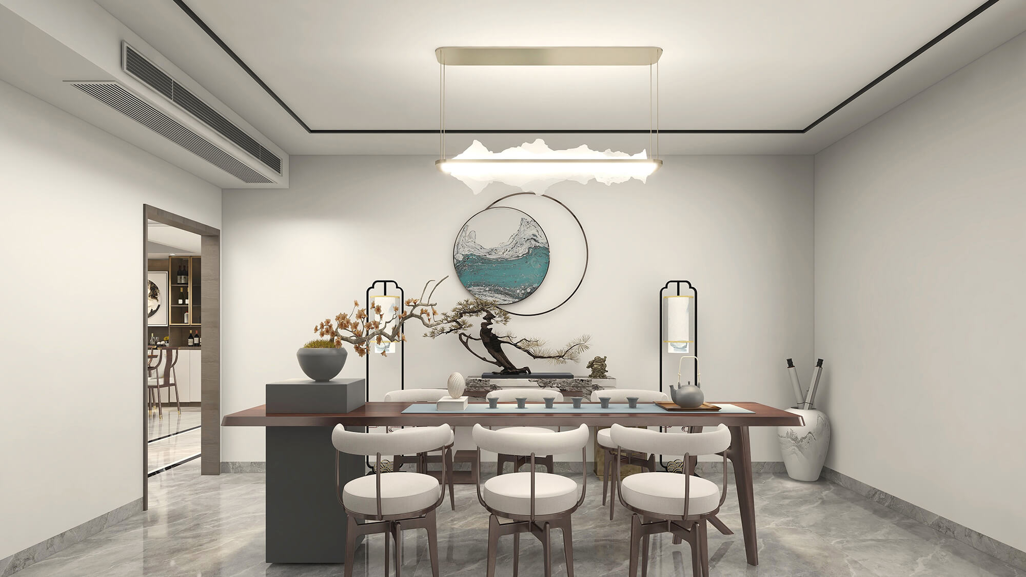 本案為220㎡的新中式風格案例。淡雅的色調(diào),呈現(xiàn)出清亮的質(zhì)感空間,現(xiàn)代飾品的擺設和新中式家具搭配,勾勒出一個極具格調(diào)的精神寧靜地帶。