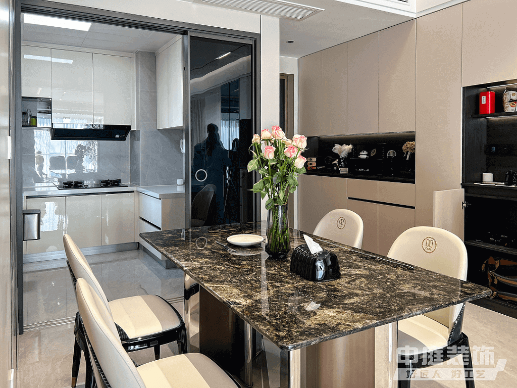 餐廳:開放廚房與餐廳結(jié)合,形成餐、廚一體空間。所有廚房電器嵌入式設(shè)計(jì),并按照業(yè)主烹飪習(xí)慣布置,保證操作動(dòng)線便捷、合理。