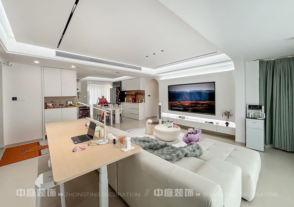 這套房子的裝修風(fēng)格屬于現(xiàn)代奶油風(fēng)格。整體以純凈的白色為主色調(diào),營(yíng)造出簡(jiǎn)潔明亮的空間感。線條設(shè)計(jì)極為流暢,如拱形門(mén)洞、無(wú)主燈的線性燈帶,弱化了復(fù)雜裝飾,凸顯極簡(jiǎn)美學(xué)。