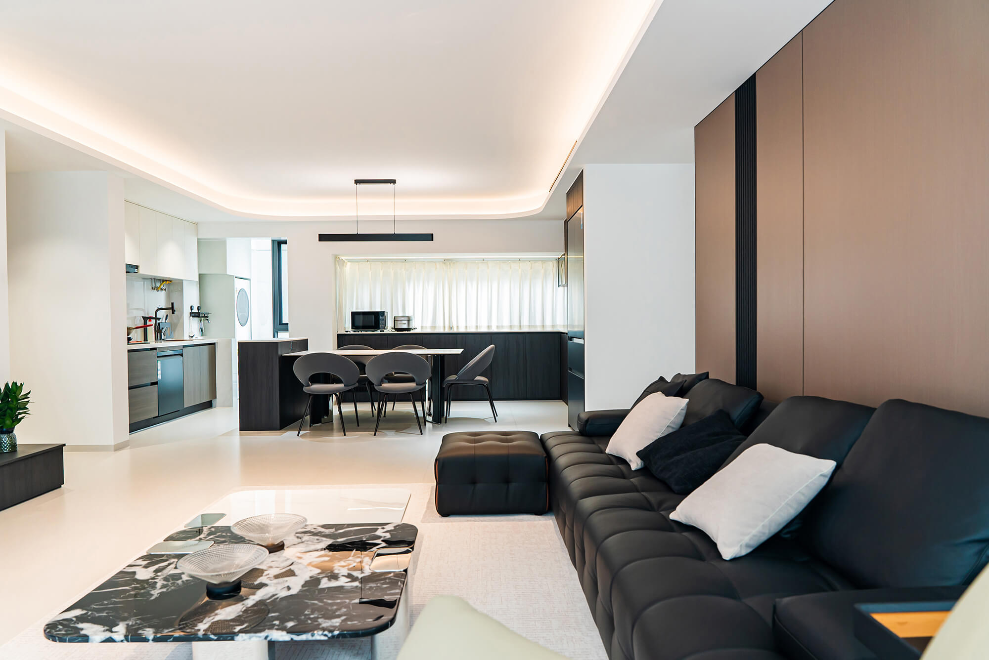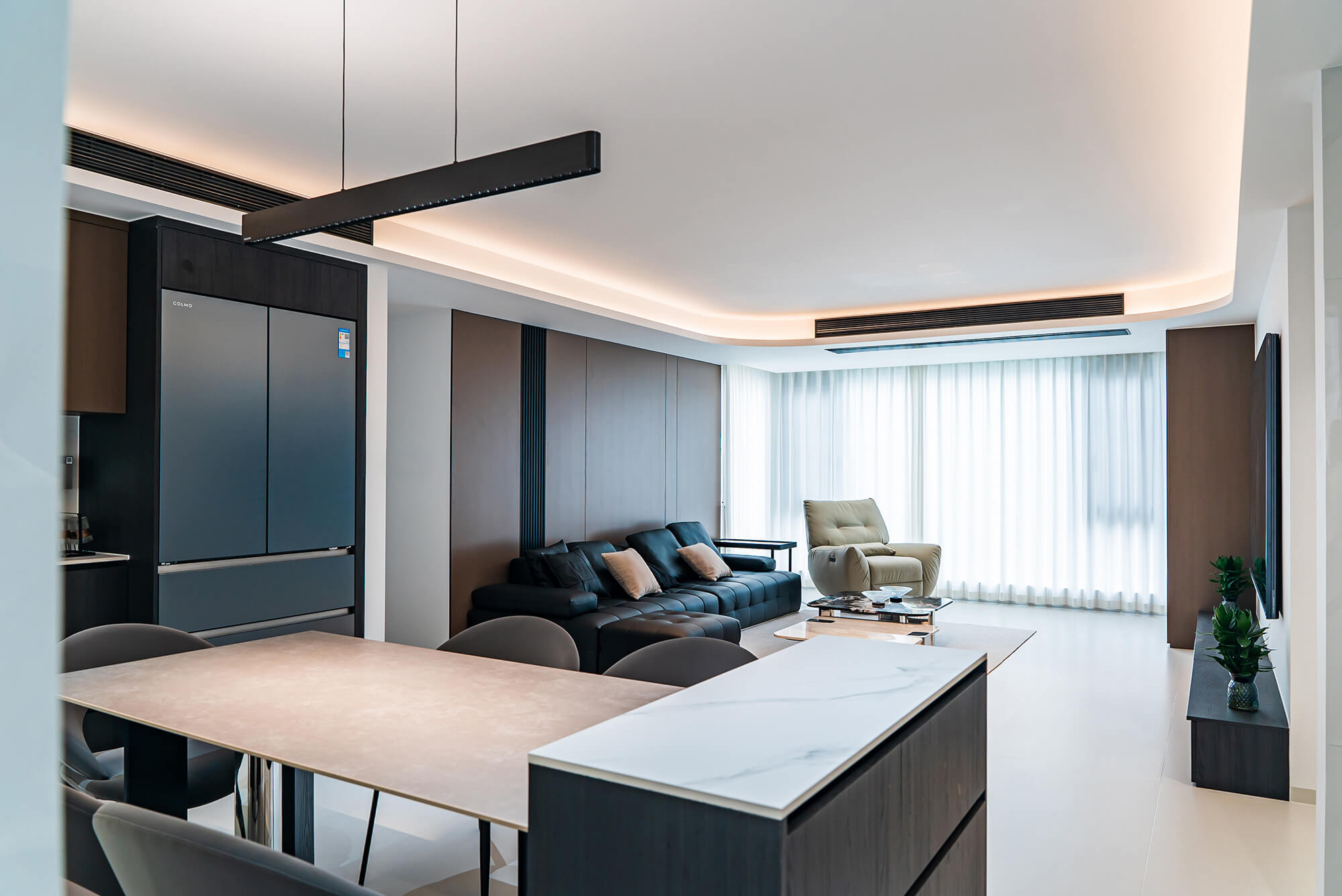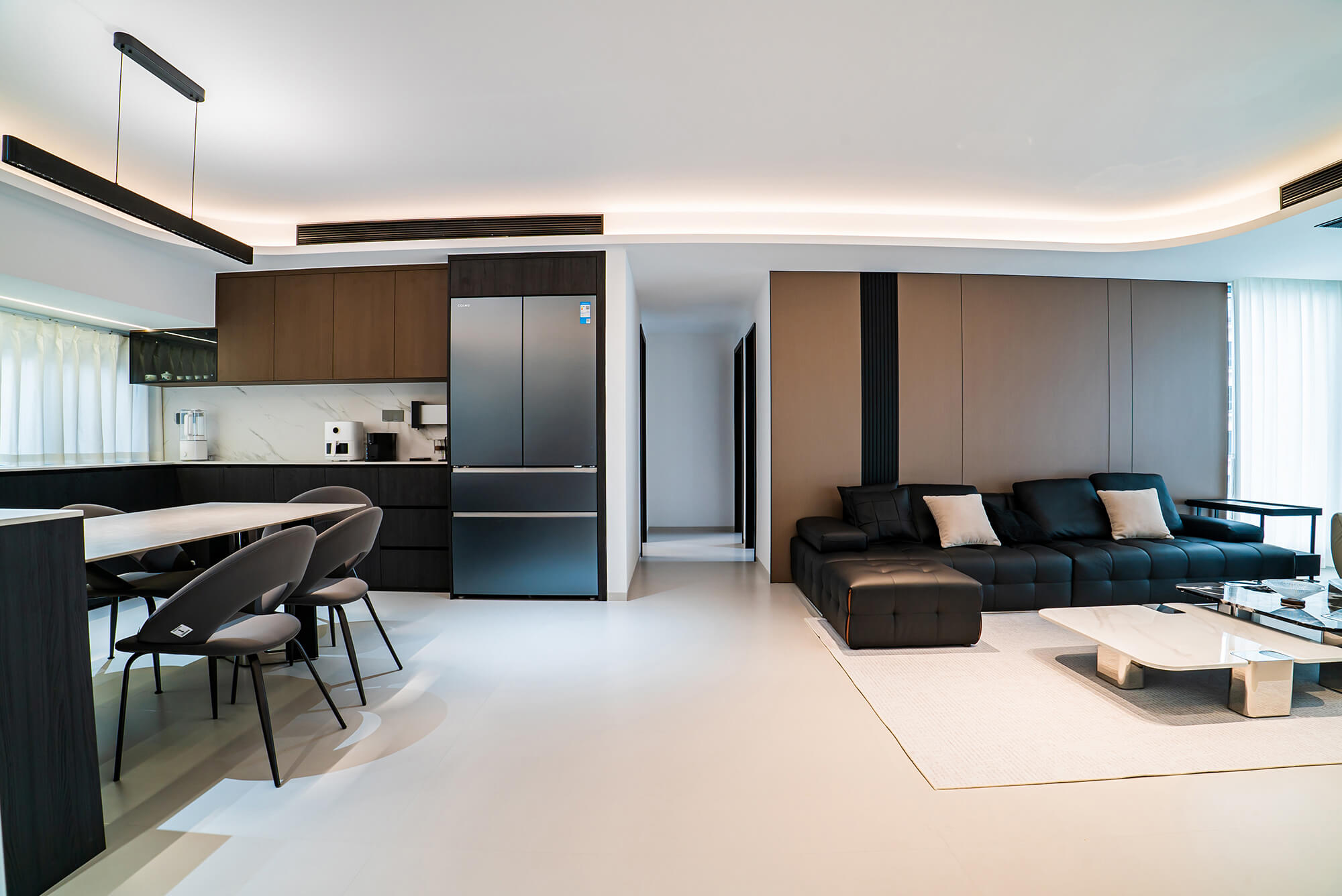 瀏覽量:217極致純粹的色彩美學(xué),以黑、白、灰三個(gè)基礎(chǔ)色構(gòu)建空間骨架,通過不同明度、材質(zhì)的層次對(duì)比(如啞光水泥、亮面巖板、磨砂金屬)豐富視覺。線條利落干脆,無多余裝飾,注重功能與結(jié)構(gòu)的統(tǒng)一性,打造冷靜、理性、富有高級(jí)質(zhì)感的極簡(jiǎn)空間。