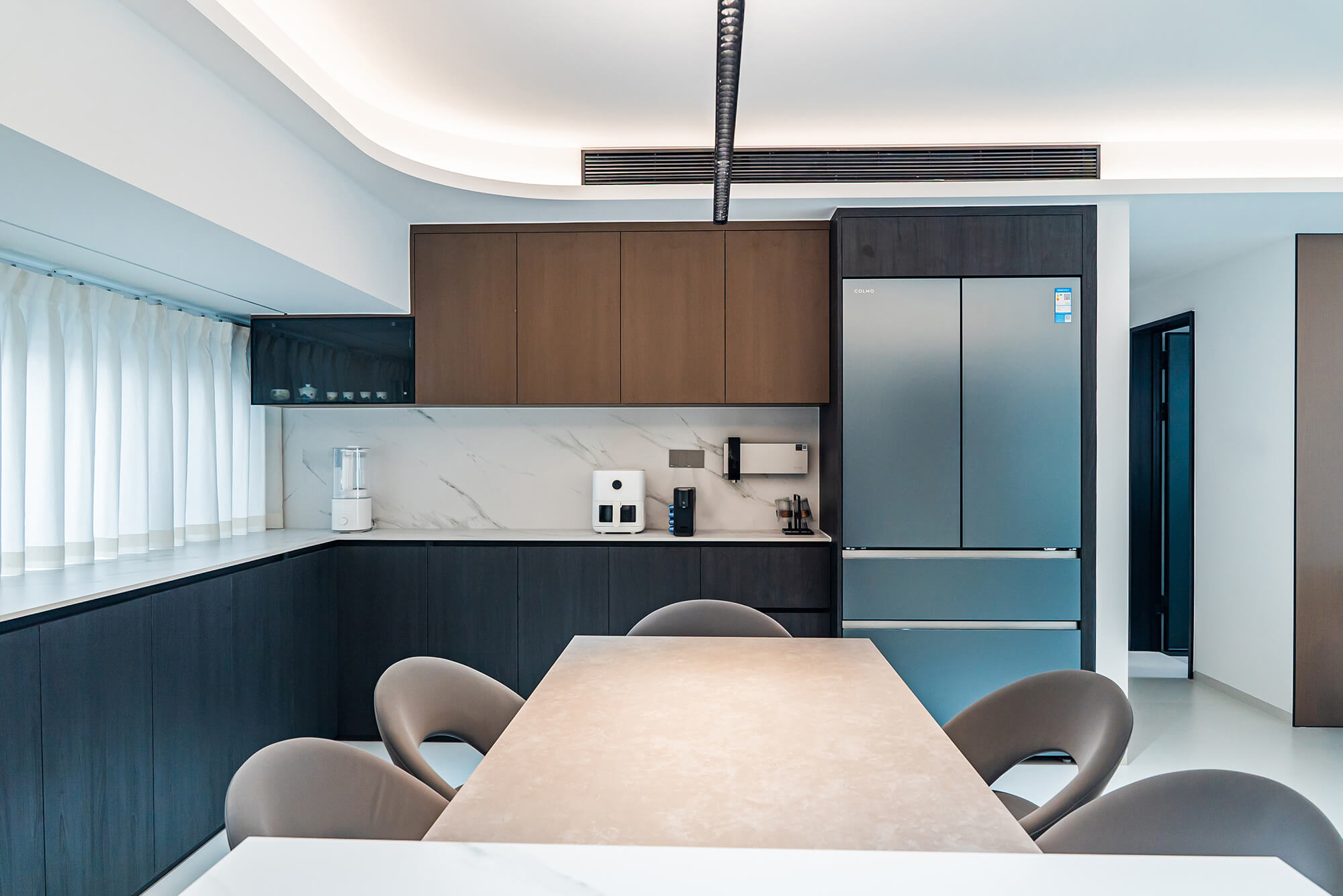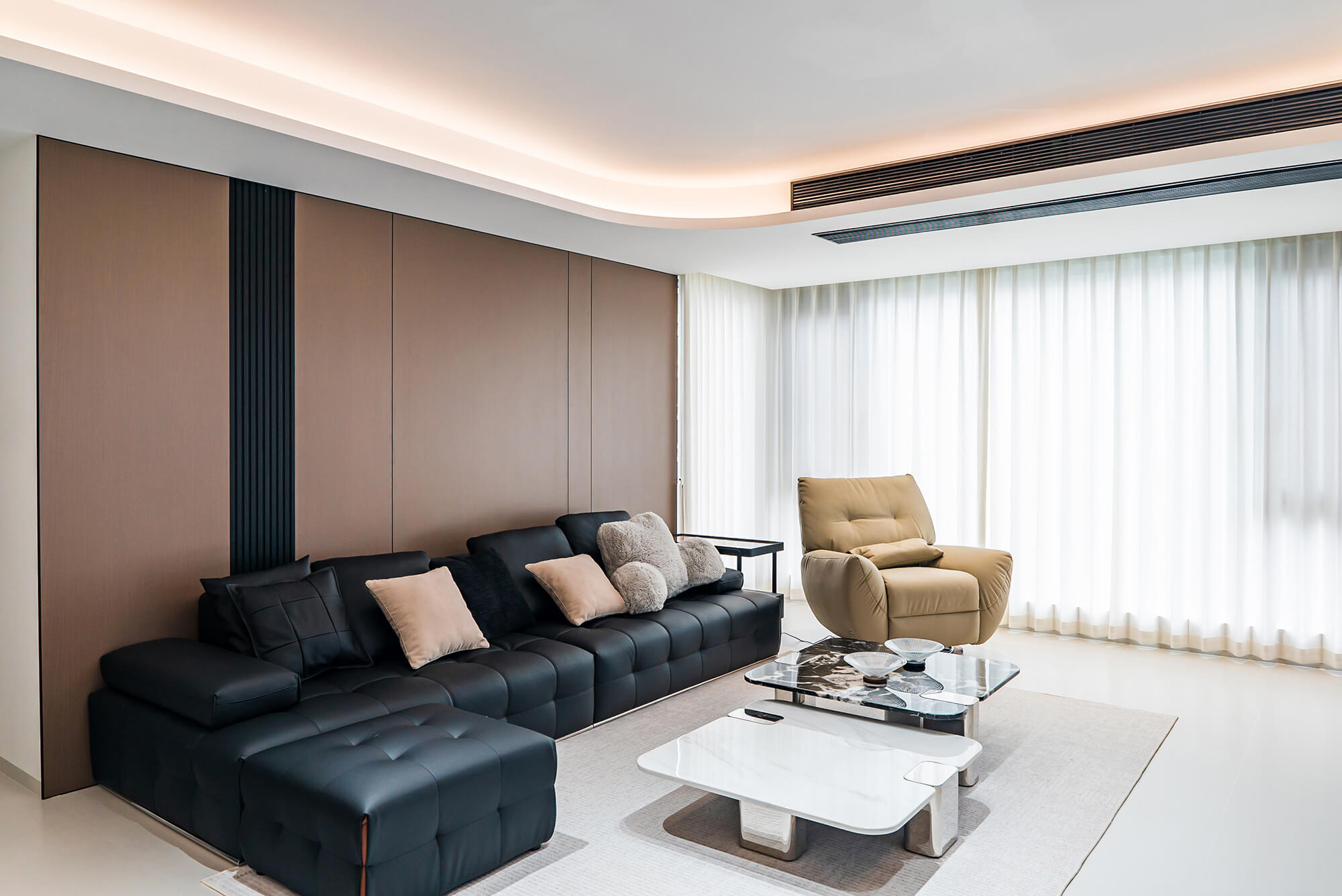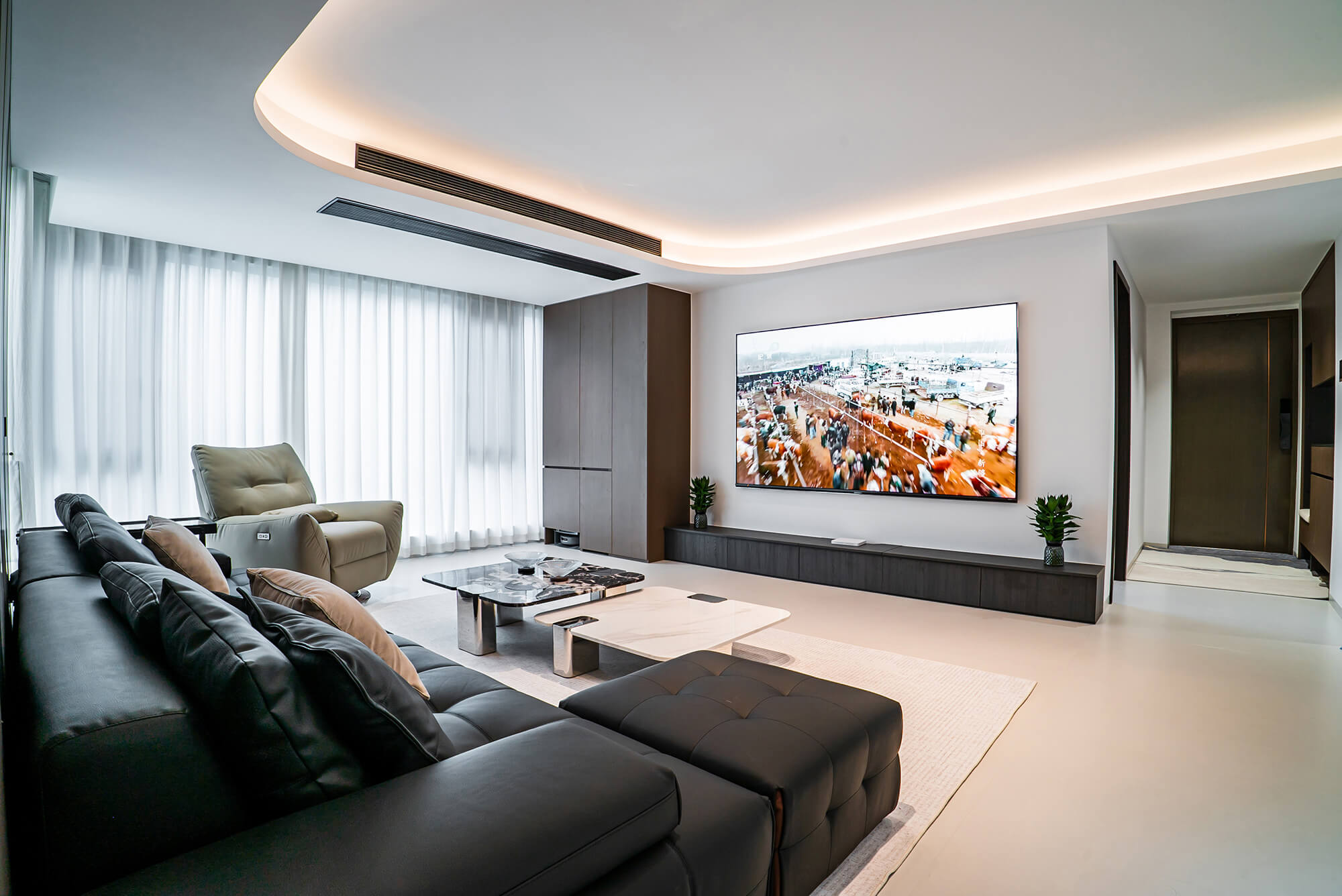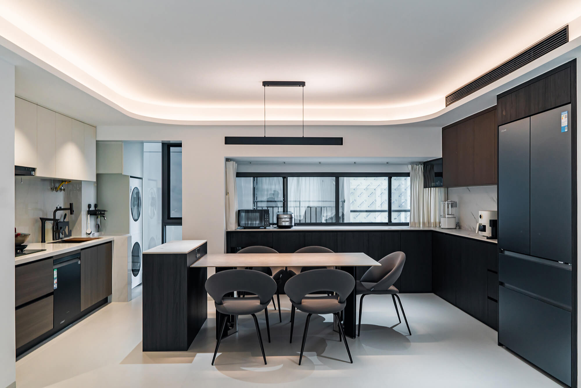 瀏覽量:217極致純粹的色彩美學(xué),以黑、白、灰三個(gè)基礎(chǔ)色構(gòu)建空間骨架,通過不同明度、材質(zhì)的層次對(duì)比(如啞光水泥、亮面巖板、磨砂金屬)豐富視覺。線條利落干脆,無多余裝飾,注重功能與結(jié)構(gòu)的統(tǒng)一性,打造冷靜、理性、富有高級(jí)質(zhì)感的極簡(jiǎn)空間。