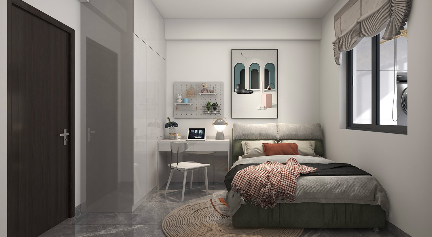 本案例戶型為:3房1廳1衛(wèi),總面積130㎡。整體家具通常采用簡約的線條和材料。家具的色調以灰色、米色、白色為主,這些顏色可以營造出一個舒適和溫馨的氛圍。